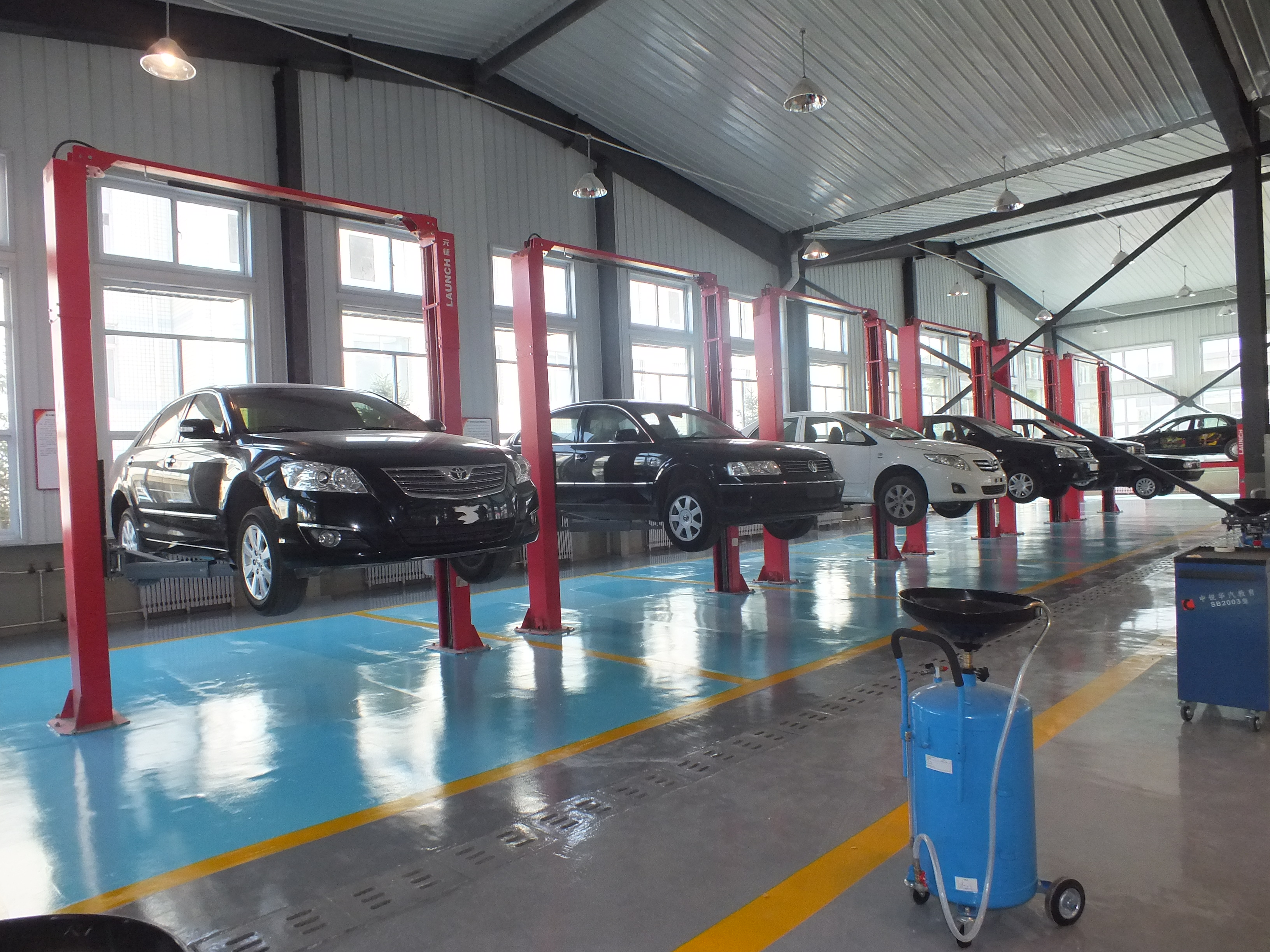 有教學車輛14臺,包括大眾、豐田、通用等汽車行業(yè)知名品牌。雙柱式舉升機6臺,四柱式舉升機1臺,用于汽車維護、汽車保養(yǎng)、汽車修理等教學生產(chǎn)工作,為學生的汽車維修事業(yè)打好基礎(chǔ)。