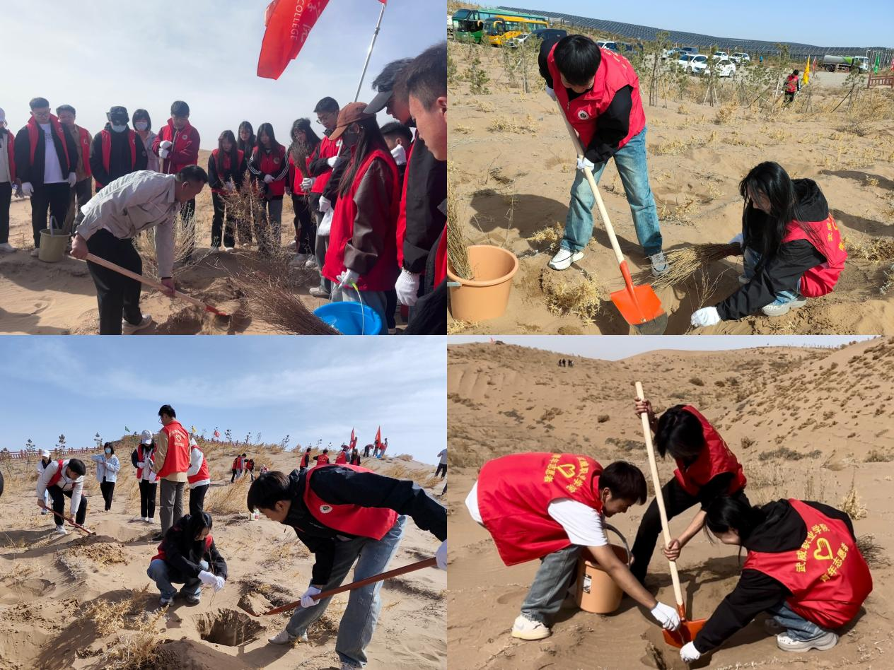 ?4月22日,在第54個世界地球日來臨之際,武威職業(yè)學(xué)院“青馬工程”培訓(xùn)班30名學(xué)員代表前往涼州區(qū)九墩鎮(zhèn)騰格里沙漠邊緣開展壓沙治沙實踐活動。學(xué)員們以“植綠護綠青年行”的實際行動,踐行習(xí)近平生態(tài)文明思想,為筑牢國家西部生態(tài)安全屏障貢獻(xiàn)青春力量。?