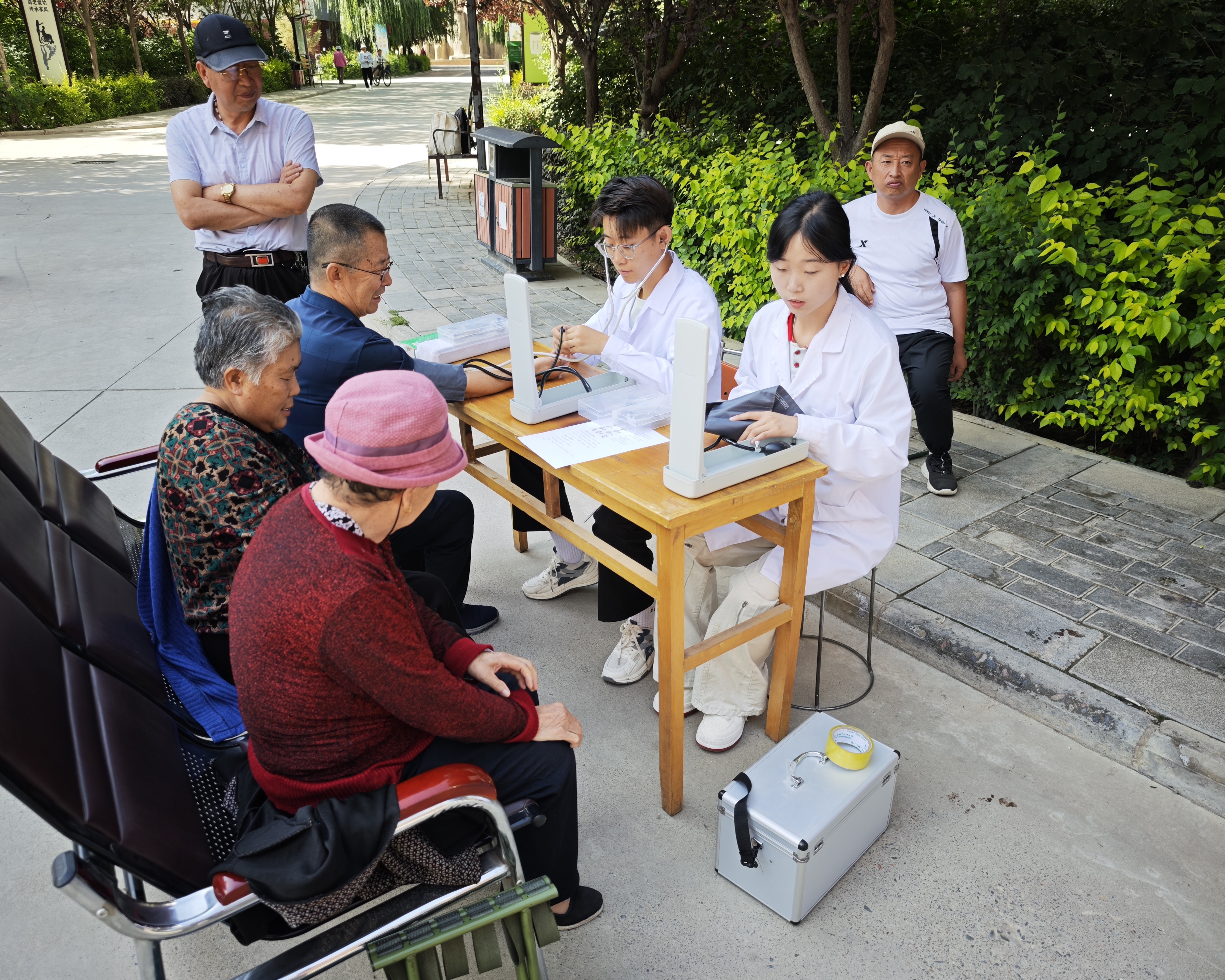 在指導(dǎo)老師的帶領(lǐng)下,志愿者們走進(jìn)武威市涼州區(qū)窯溝村,他們手持血壓計(jì)為村民細(xì)心測(cè)量,指尖傳遞著溫暖的守護(hù)。針對(duì)常見(jiàn)的高血壓?jiǎn)栴},志愿者們將書(shū)本的醫(yī)學(xué)知識(shí)化作“少鹽多醋常走動(dòng)”的貼心叮嚀;艾灸棒在老人膝蓋處揮舞,老人們微闔雙眼,皺紋間舒展開(kāi)寧?kù)o的笑意。志愿者精心準(zhǔn)備了蘊(yùn)含中藥智慧的五色香囊,讓預(yù)防保健的種子在老人們心中生根發(fā)芽。