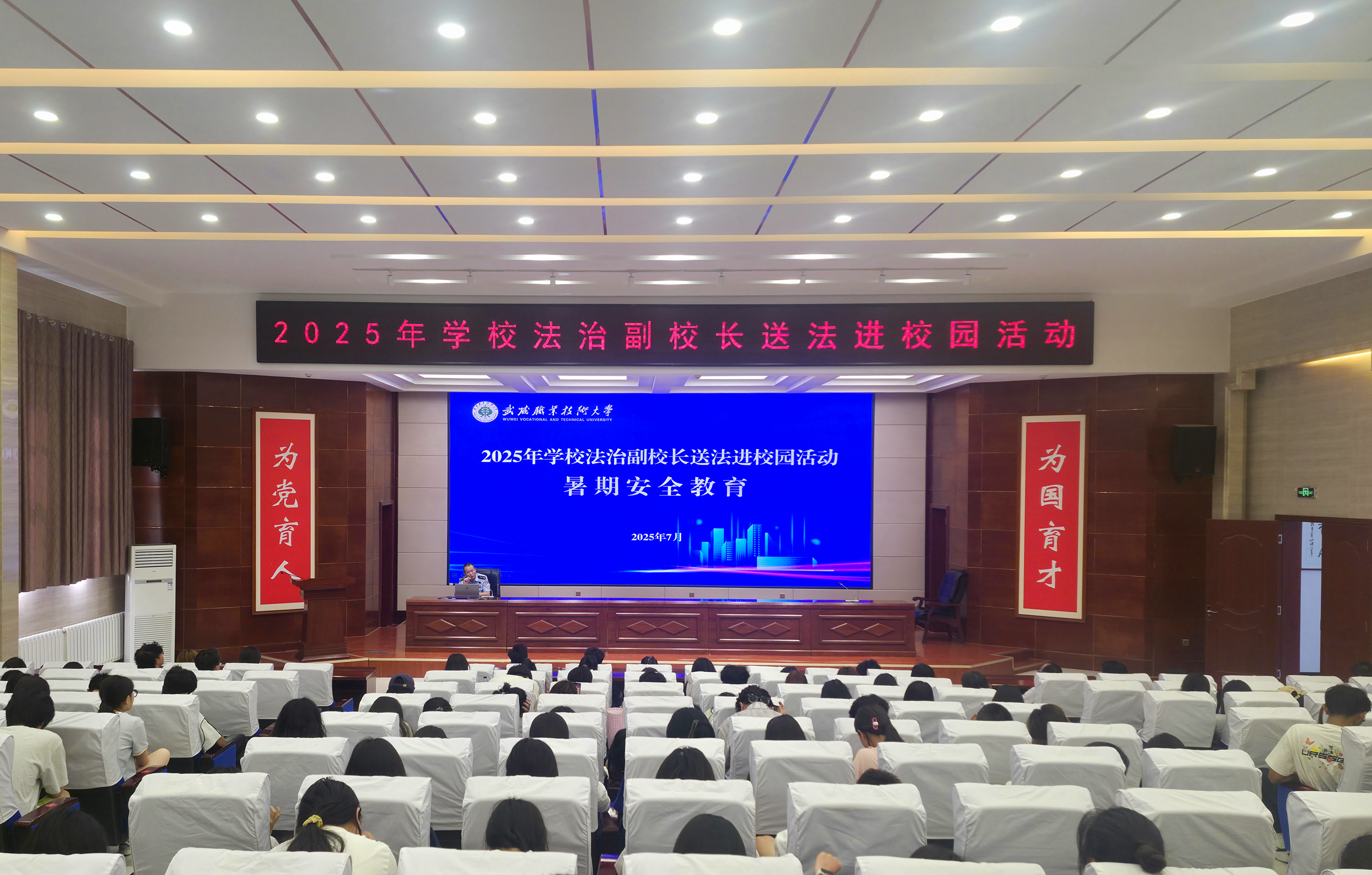 7月7日,學(xué)校法治副校長進(jìn)校開展“送法進(jìn)校園”宣講活動,旨在進(jìn)一步提升師生安全防護(hù)與法治素養(yǎng),為暑期安全保駕護(hù)航。安全保衛(wèi)處、學(xué)生工作部負(fù)責(zé)同志及各學(xué)院輔導(dǎo)員、學(xué)生代表共200余人參加活動。?