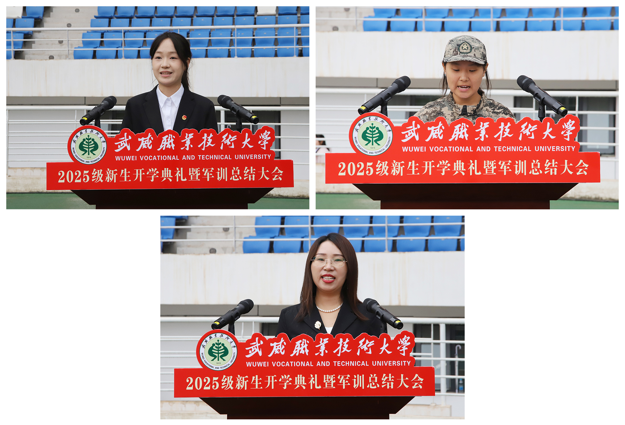 新生代表信息技術(shù)學(xué)院2025級(jí)物聯(lián)網(wǎng)本科專業(yè)學(xué)生胥媛,教師代表2025年武威市優(yōu)秀教師、護(hù)理學(xué)院王艷麗,在校生代表藝術(shù)與教育學(xué)院2023級(jí)學(xué)前教育專業(yè)潘怡彤先后發(fā)言,分享了她們各自在工作、學(xué)習(xí)中的心得,勉勵(lì)大家要樹(shù)立遠(yuǎn)大理想、始終追求卓越、保持軍訓(xùn)底色、珍惜求學(xué)時(shí)光,不負(fù)青春、不負(fù)時(shí)代。