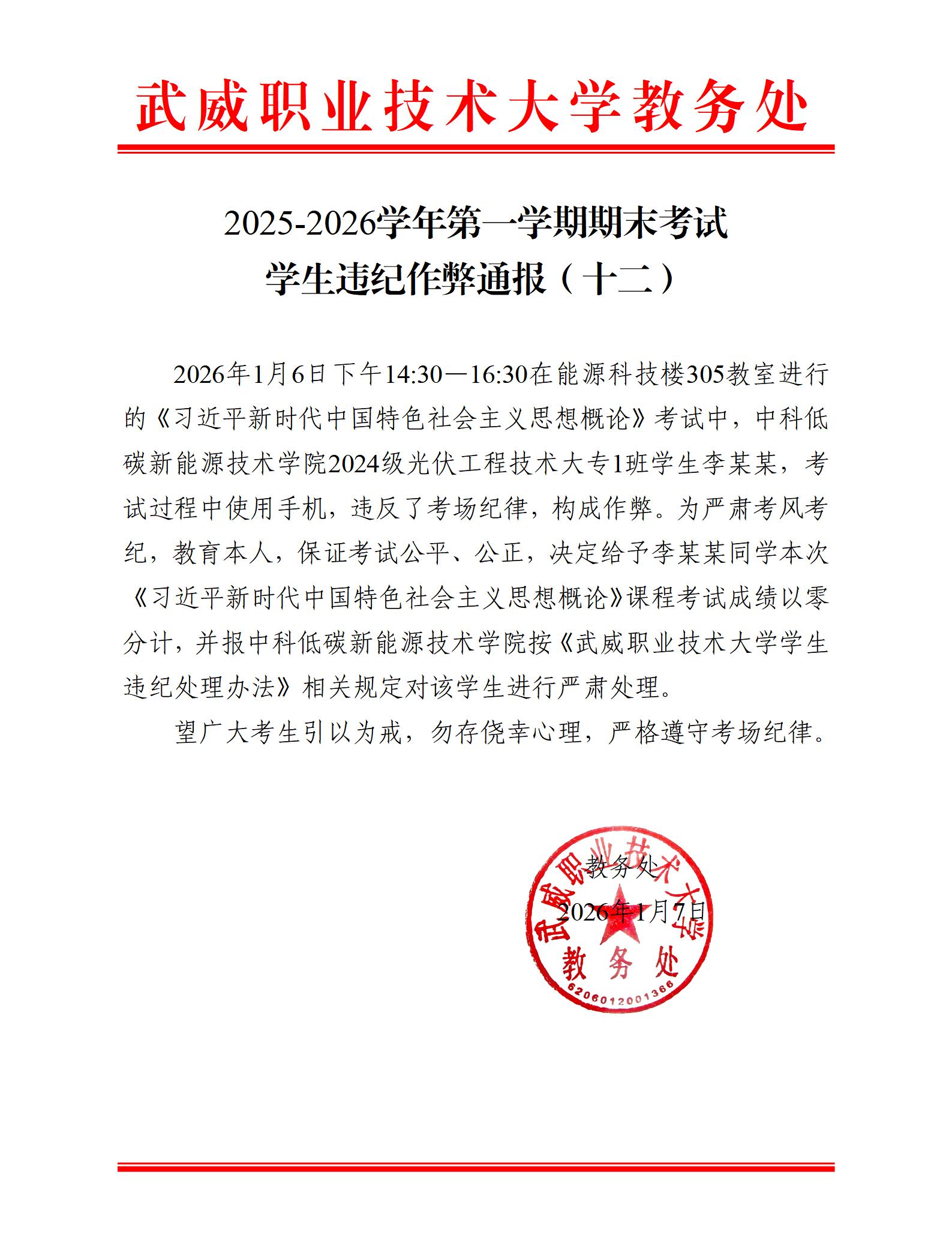 2025-2026學(xué)年第一學(xué)期期末考試學(xué)生違紀(jì)作弊通報(bào)(十二)