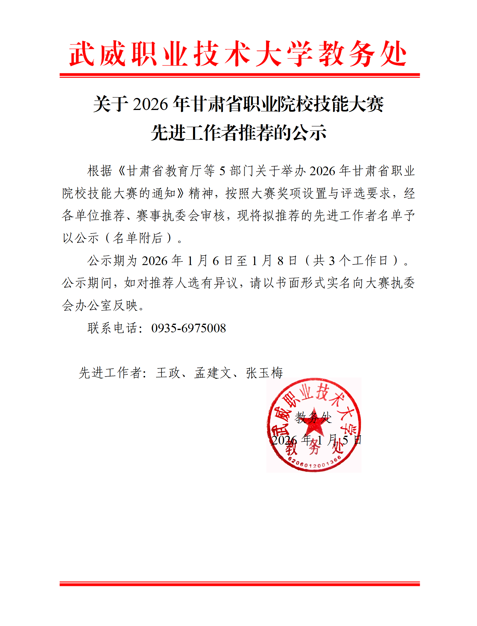 關(guān)于2026年甘肅省職業(yè)院校技能大賽先進工作者推薦的公示