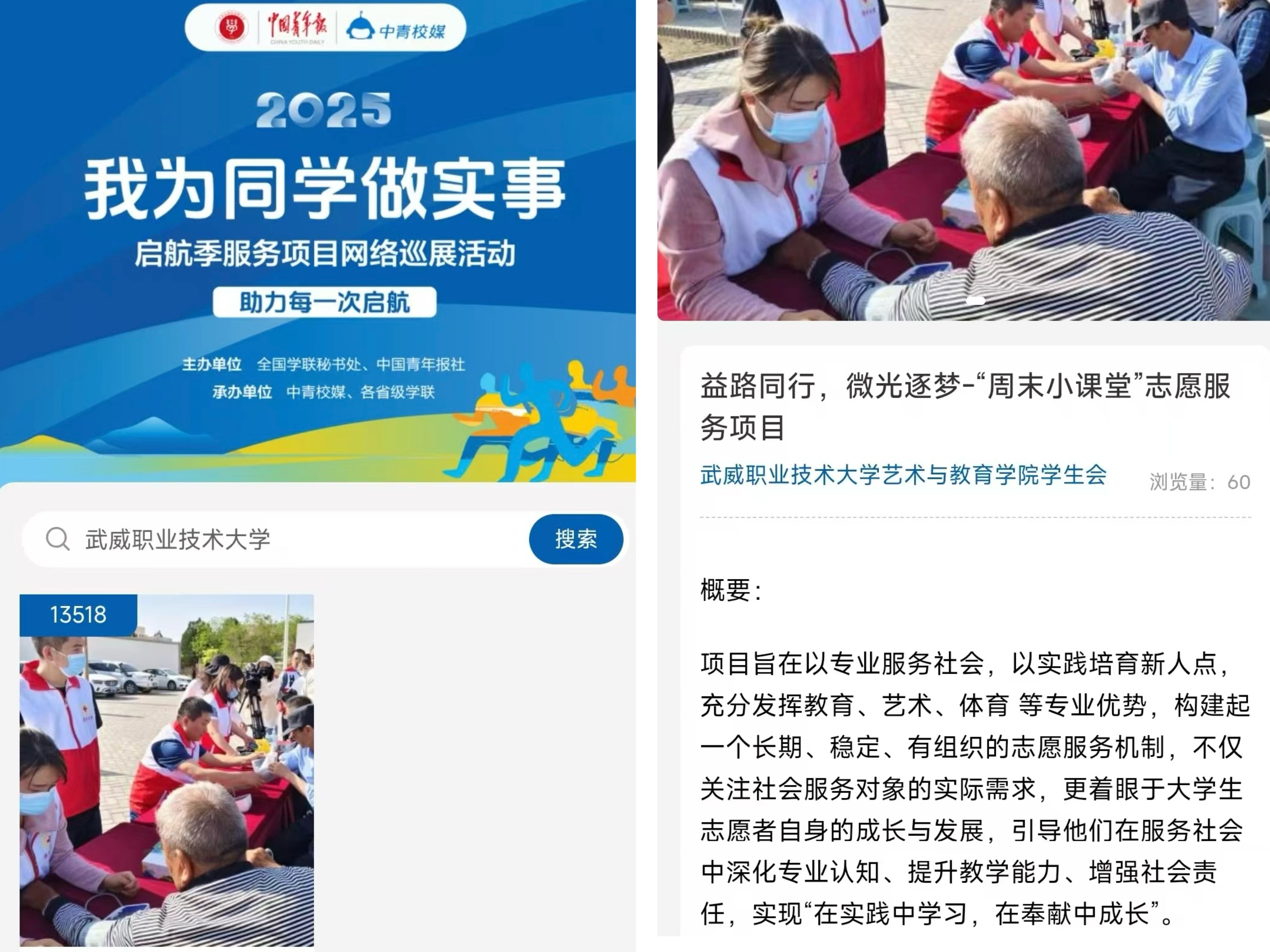 近日,由共青團中央指導,全國學聯(lián)秘書處與中國青年報、中青校媒聯(lián)合發(fā)起的全國高校學生會組織“我為同學做實事”啟航季服務項目網絡巡展活動公布入選名單。藝術與教育學院學生會申報的“益路同行,微光筑夢”周末小課堂服務項目從全國896所院校的1662個項目中脫穎而出。