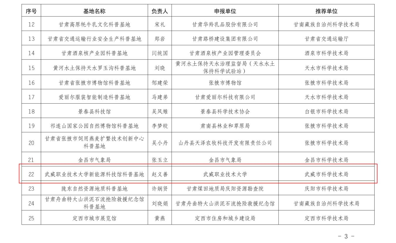 為深入貫徹國家創(chuàng)新驅(qū)動發(fā)展戰(zhàn)略,服務“雙碳”目標,由武威職業(yè)技術(shù)大學中科低碳新能源技術(shù)學院作為主體單位申報、學校科技處積極引導和扶持科普能力建設的甘肅省“武威職業(yè)技術(shù)大學新能源科技館科普基地”成功獲批,標志著我校在新能源科普教育、科研創(chuàng)新與社會服務方面邁上新臺階。