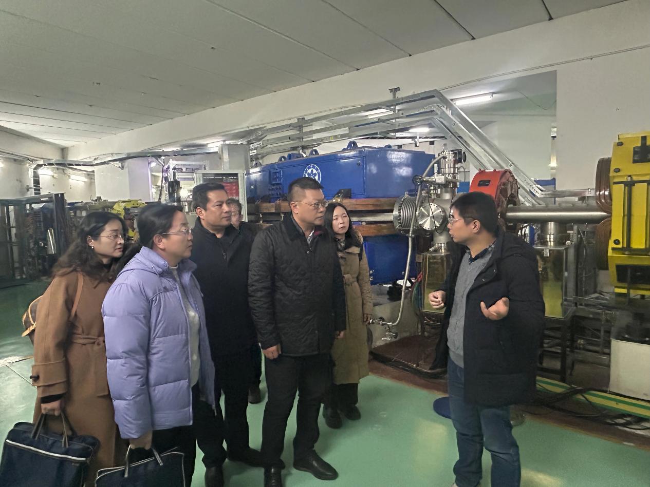 隨后,在醫(yī)用探測器室主任毛瑞士與副主任徐治國的陪同下,調(diào)研組實地參觀了“國之重器”——蘭州重離子加速器裝置,詳細了解了其結(jié)構(gòu)組成、運行機制與核心技術(shù)原理。毛瑞士結(jié)合該裝置在重離子醫(yī)用探測器研發(fā)、醫(yī)用束測控制等領(lǐng)域的實際應(yīng)用,闡釋了核探測技術(shù)對提升醫(yī)學(xué)診療精度的支撐作用,使調(diào)研組成員切身感受到大科學(xué)裝置的科技魅力與實用價值。