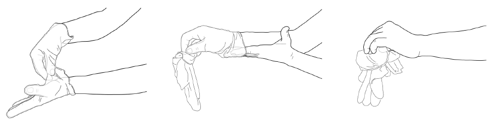 2.戴著手套的手握住脫下的手套,用脫下手套的手捏住另一只手套清潔面(內(nèi)面)的邊緣,將手套脫下;
