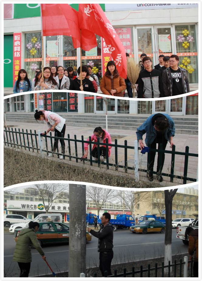 電子信息工程系團總支結(jié)合團市委、院團委《關(guān)于開展城鄉(xiāng)環(huán)境衛(wèi)生整治青年志愿服務(wù)活動的通知》安排,3月3日下午16:30組織20名團員青年在學院北門口道路兩側(cè)開展了衛(wèi)生死角清掃,柵欄清潔,果皮箱清潔,公交站臺清潔,小廣告清理,垃圾清運。學生志愿者盡己所能,服務(wù)社會,傳播勞動信念,為建設(shè)美好社會貢獻自己的一份微薄力量。