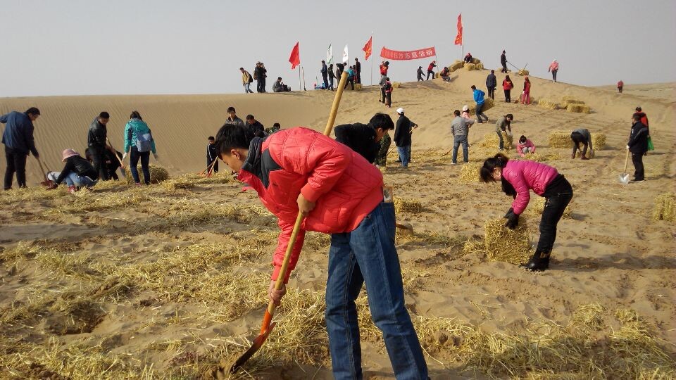 早上9點(diǎn),志愿者們?cè)谖渫星嗄曛驹刚邊f(xié)會(huì)的帶領(lǐng)下參觀了民勤防沙治沙展覽館,了解了勤勞的民勤人民在防沙治沙的歷程中付出的艱辛和取得的成果。隨后,志愿者們到達(dá)了民勤縣薛百鄉(xiāng)黃篙井的壓沙現(xiàn)場(chǎng),按照劃分好的區(qū)域,在專業(yè)技術(shù)人員指導(dǎo)下,志愿者們鋪草壓沙,勞動(dòng)場(chǎng)面分工明確,井然有序。經(jīng)過(guò)一天的辛勤勞動(dòng),50余畝沙丘變成了棋格般整齊的沙障,堅(jiān)實(shí)的沙障阻止了沙丘的移動(dòng),為明春造林活動(dòng)打好了基礎(chǔ)。
