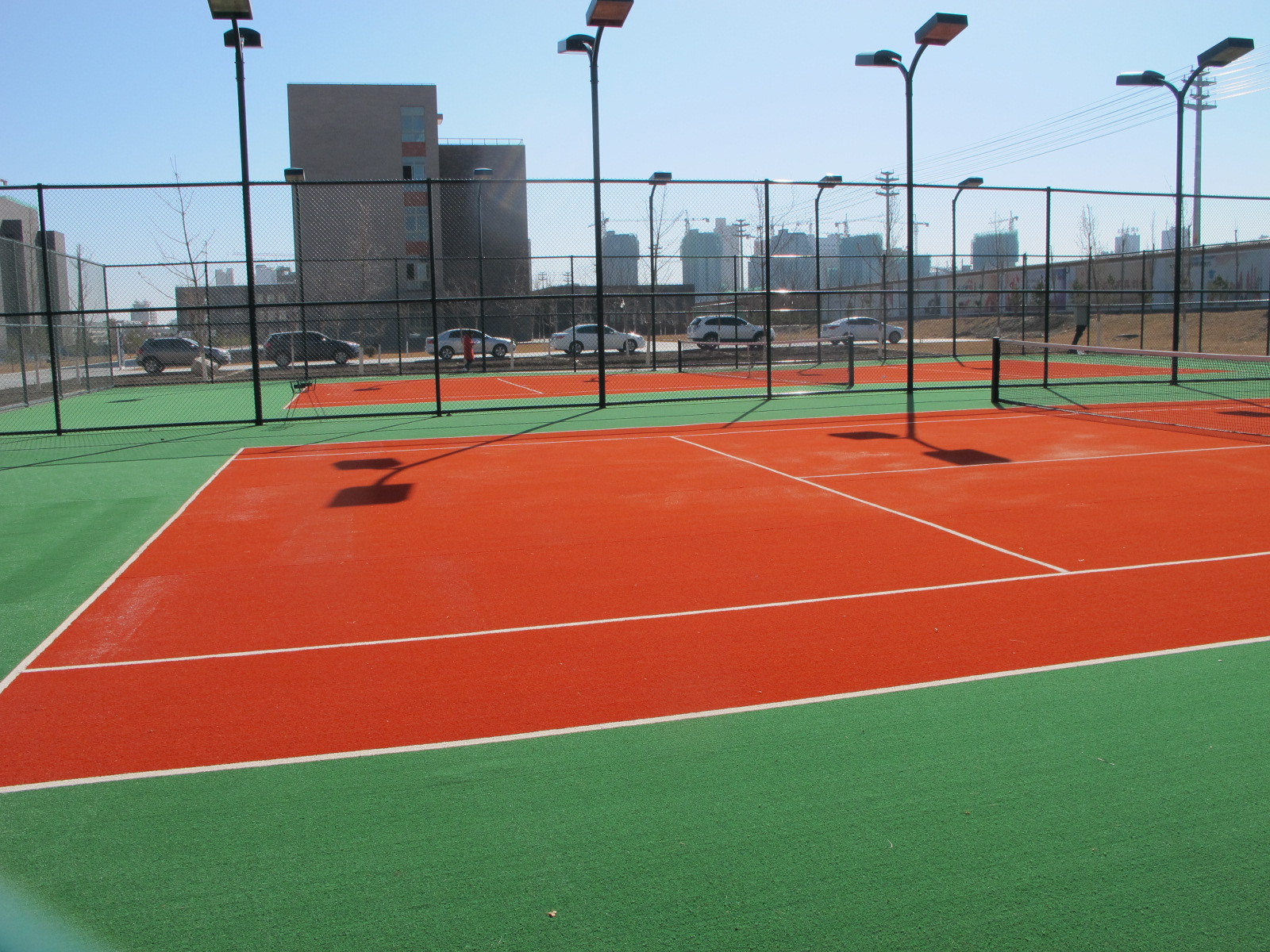 學(xué)院網(wǎng)球場采用標(biāo)準(zhǔn)尺寸設(shè)計,包括兩個標(biāo)準(zhǔn)場地。外鋪設(shè)彩色散水磚,內(nèi)鋪設(shè)人工草坪和塑膠場。其中每個網(wǎng)球場南北長36.6米,東西寬18.3米。施工包括彈性球場基礎(chǔ)工程,彈性球場面層工程,網(wǎng)球場圍網(wǎng)、攔網(wǎng)及網(wǎng)球場照明工程組成。