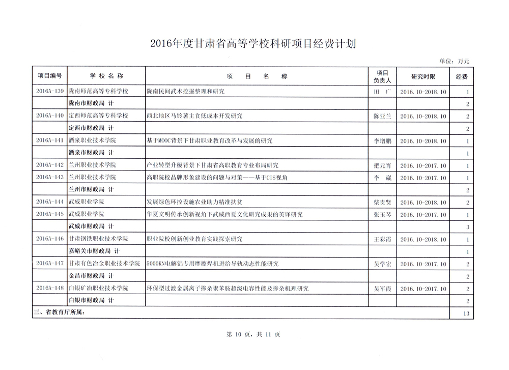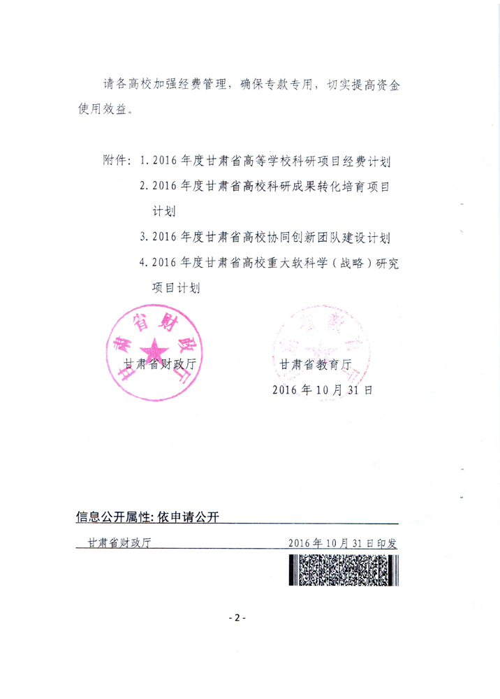 轉(zhuǎn)發(fā)甘肅省財政廳 教育廳文件 關(guān)于下達2016年度甘肅省高等學??蒲许椖孔浴?/a>[ 12-02 ]