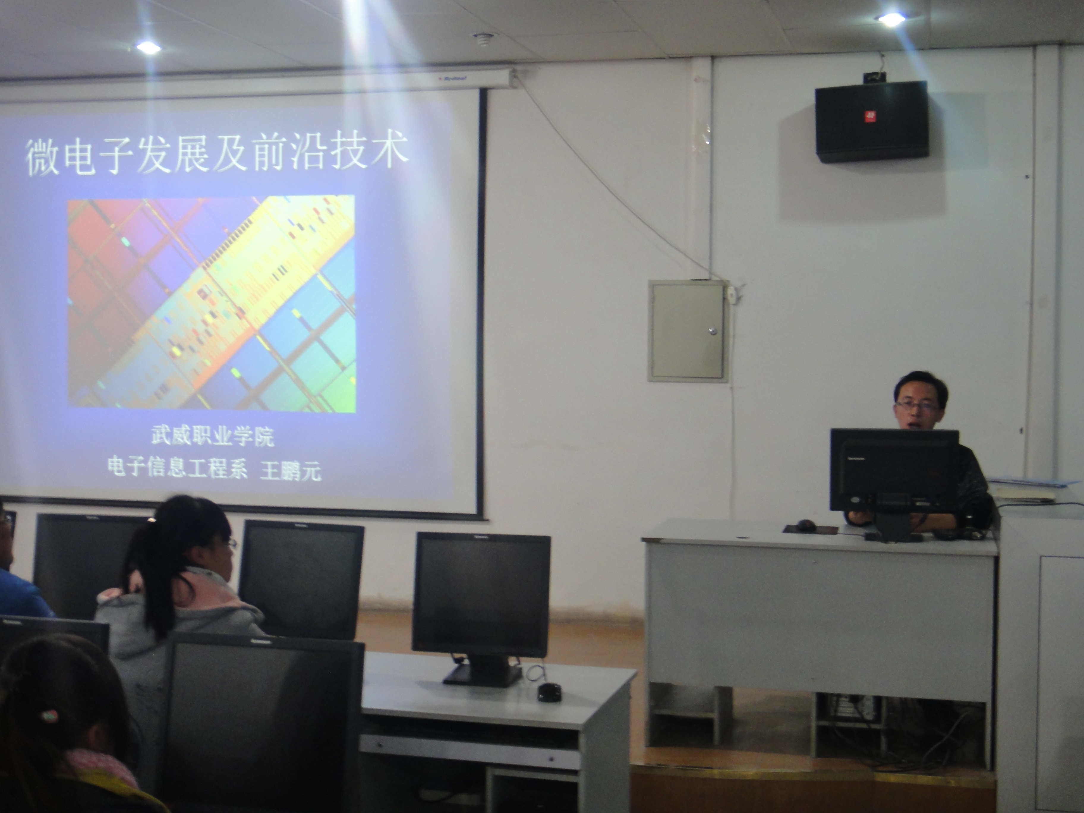 王老師以世界電子發(fā)展歷史為背景,先后講解了微電子發(fā)展及前沿技術(shù)、集成電路應(yīng)用60年、晶體管的發(fā)明、世界上第一臺計算機(jī)的誕生及發(fā)展、多核微處理器、微電子技術(shù)的主要發(fā)展方向、集成電路制造工藝、新器件與新材料、集成電路走向系統(tǒng)芯片、集成電路的發(fā)展史、MEMS技術(shù)和生物信息技術(shù)將成為下一代半導(dǎo)體主流技術(shù)等內(nèi)容;之后又結(jié)合自身經(jīng)歷在不斷地發(fā)問中引導(dǎo)同學(xué)們思考,簡單介紹了電源電路、基本元器件的識別,示波器等測量儀器的使用。