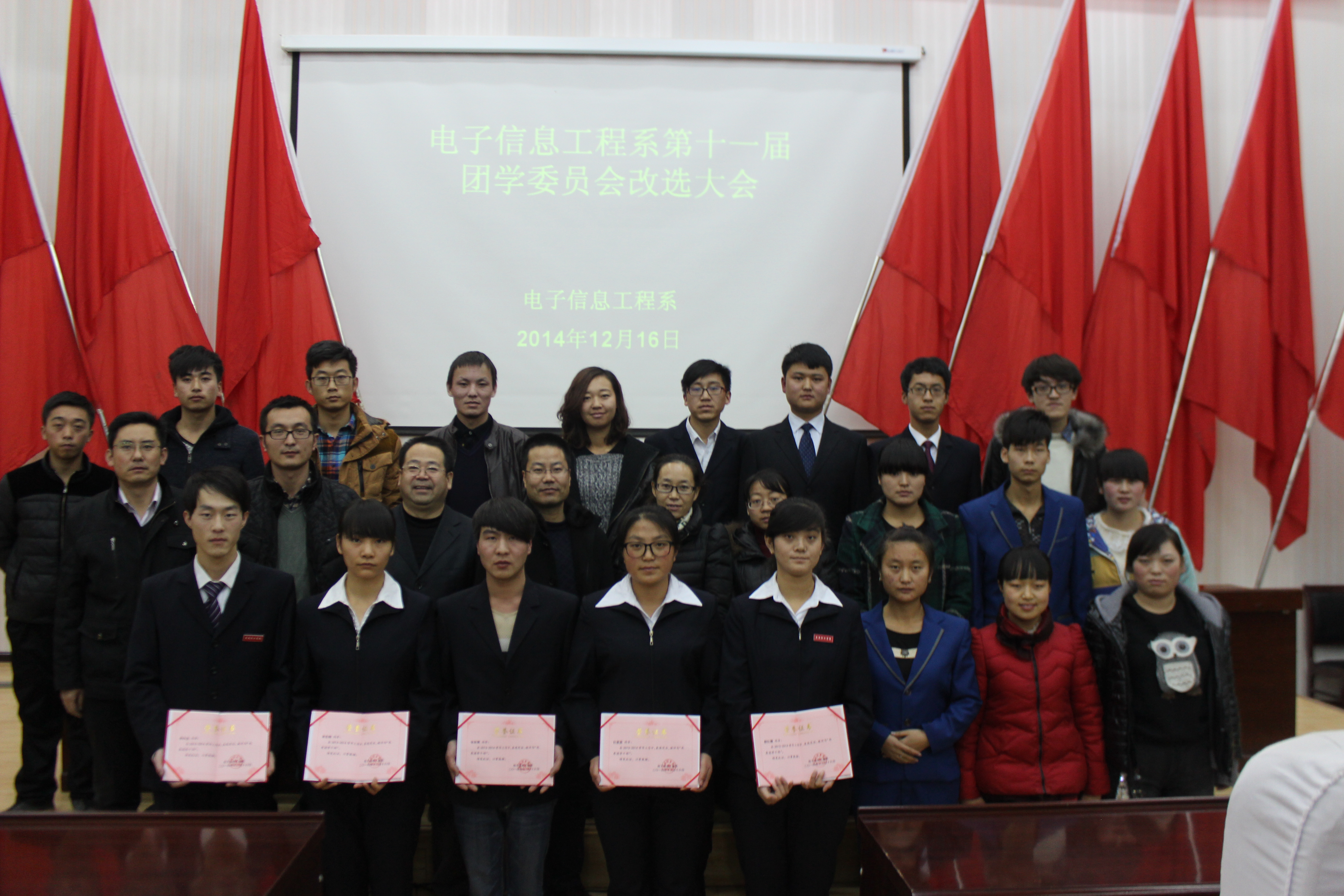 系主任白玉珍對我系團(tuán)學(xué)工作給予了高度的評價(jià),對上一屆團(tuán)總支學(xué)生會(huì)優(yōu)秀學(xué)生干部進(jìn)行了表彰并頒發(fā)了榮譽(yù)證書。最后系書記張伯成致閉幕詞,認(rèn)為我系團(tuán)學(xué)工作緊密圍繞學(xué)風(fēng)建設(shè)這一中心,著力推進(jìn)對學(xué)生的各項(xiàng)服務(wù),開展了一系列富有特色的活動(dòng),取得了良好的成效。他還對我系的團(tuán)學(xué)工作提出了新的要求,希望新一屆團(tuán)學(xué)干部做到加強(qiáng)政治理論學(xué)習(xí),做好模范帶頭作用,克服困難,團(tuán)結(jié)一致,服務(wù)好全系學(xué)生,為實(shí)現(xiàn)電子信息工程系學(xué)生工作新的跨越努力。