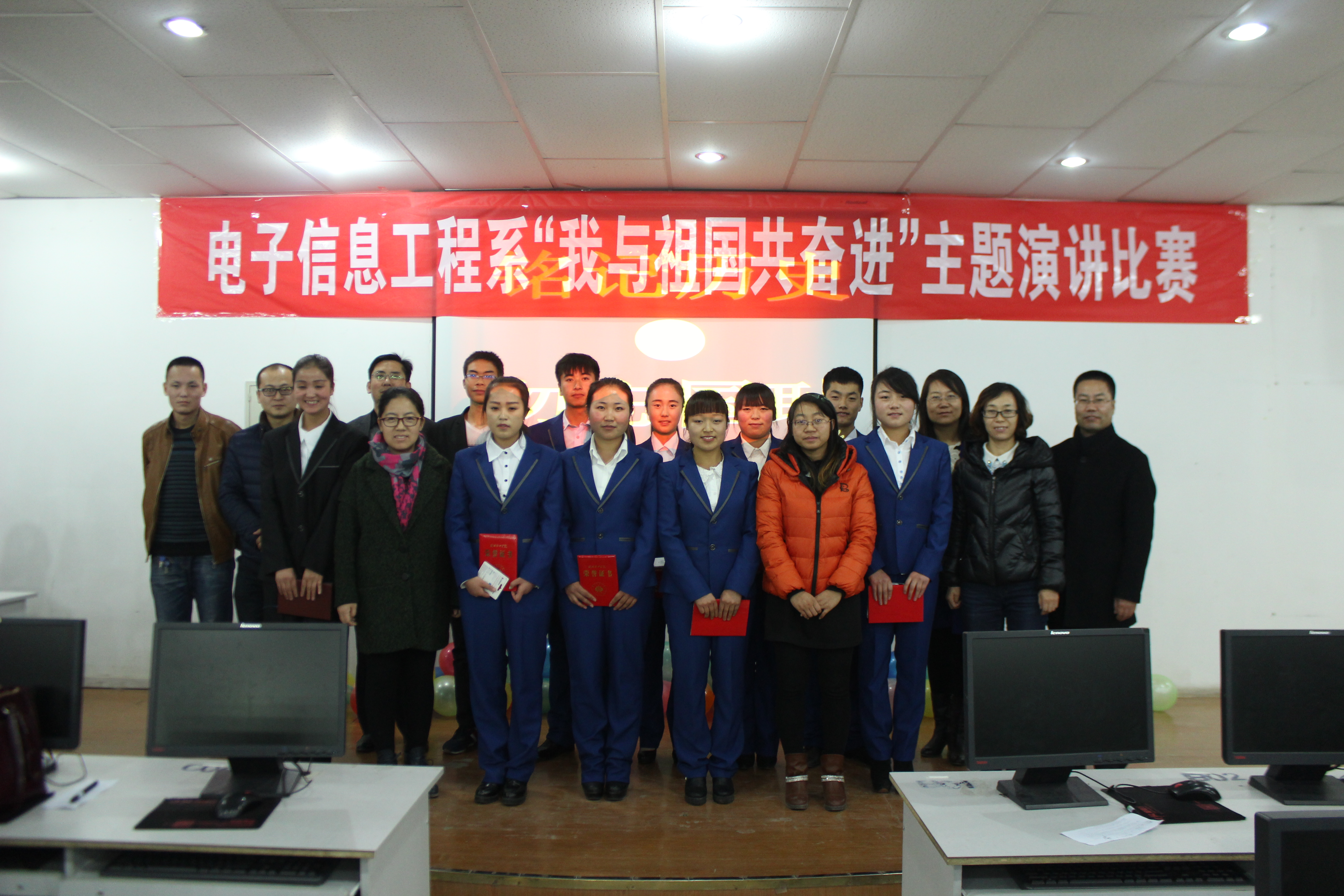 為紀(jì)念“12·9”學(xué)生愛國運(yùn)動80周年,激發(fā)我系青年學(xué)生的愛國熱情和報(bào)國之志,進(jìn)一步培育和踐行社會主義核心價(jià)值觀,提高學(xué)生思想政治素質(zhì),12月6日晚,電子信息工程系在尚德樓11號機(jī)房舉辦了“我與祖國共奮進(jìn)”主題演講比賽。電子信息工程系黨總支書記張伯成、輔導(dǎo)員鄧偉華、團(tuán)總支書記唐宗舜、全體班主任及系團(tuán)總支180多名團(tuán)員青年觀看了比賽。
