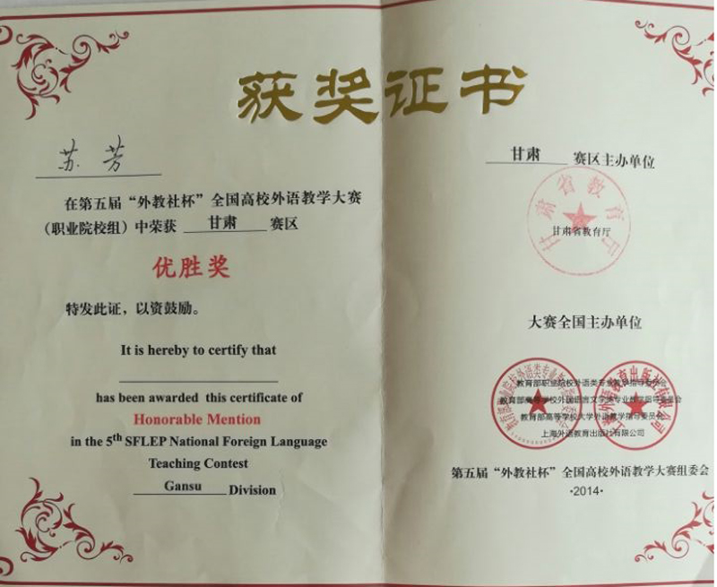 蘇芳榮獲2014年第五屆“外教社”杯全國高校外語教學(xué)大賽(職業(yè)院校組)甘肅賽區(qū)優(yōu)勝獎(jiǎng)