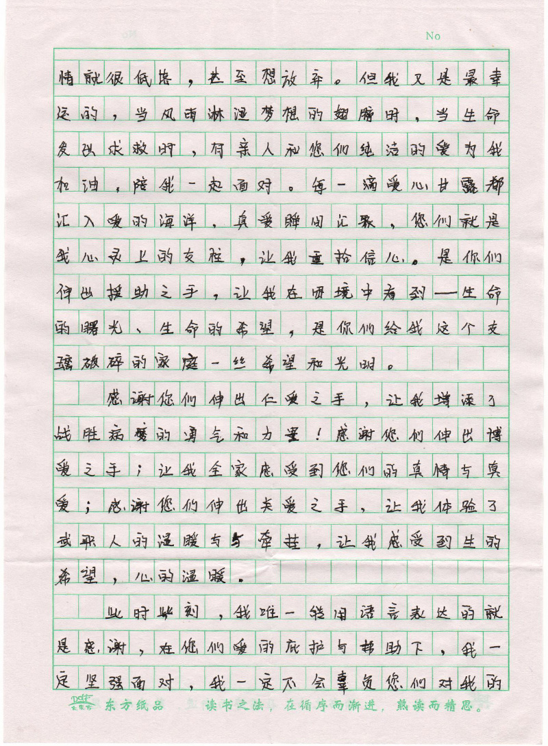 高國(guó)棟是我院機(jī)械制造系2015級(jí)機(jī)械設(shè)計(jì)與制造大專班學(xué)生,于2017年4月確診為慢性粒細(xì)胞白血病。得知這一特殊情況后,學(xué)院宣傳統(tǒng)戰(zhàn)部、團(tuán)委、學(xué)生工作處第一時(shí)間向全院廣大師生發(fā)出倡議,號(hào)召大家獻(xiàn)出愛心,幫助高國(guó)棟同學(xué)度過難關(guān)。學(xué)院廣大師生紛紛解囊,慷慨相助。目前捐助的善款已經(jīng)交給高國(guó)棟同學(xué)。為此,高國(guó)棟同學(xué)特意寫來(lái)感謝信,表達(dá)對(duì)母校廣大師生的感激之情。在此,我們衷心祝愿高國(guó)棟同學(xué)能在困境中迎難而上,樹立戰(zhàn)勝疾病的信心,爭(zhēng)取早日康復(fù),重返校園。