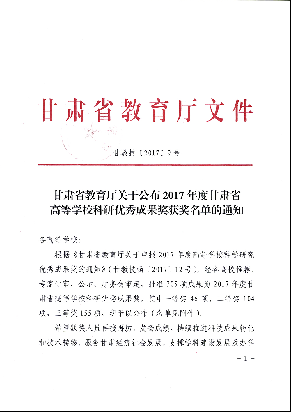 轉(zhuǎn)發(fā)甘肅省教育廳關(guān)于公布2017年度甘肅省高等學(xué)校科研優(yōu)秀成果獎(jiǎng)獲獎(jiǎng)名單的通知