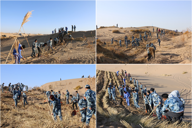 在勞動現(xiàn)場,學(xué)院領(lǐng)導(dǎo)和師生們不畏冬寒,分工協(xié)作,按照標(biāo)準(zhǔn)和要求劃線開溝、蒲草培沙、等距離推進(jìn),現(xiàn)場一片熱火朝天的景象。荒蕪的沙地身披新衣,整齊的稻草方格逐漸向遠(yuǎn)處的沙丘覆蓋。